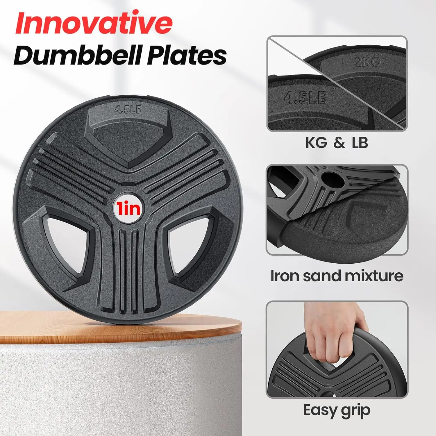 - 【Innovative Dumbbell Plates】Innovative dumbbell plates feature dual KG & LB units, eliminating hassle of weight conversion. Constructed from high-quality PE, these plates absorb shock and protect floors. Deep grooves ensure easy grip. rust-free and odor-free interior is made from a mix of cement and iron sand.
