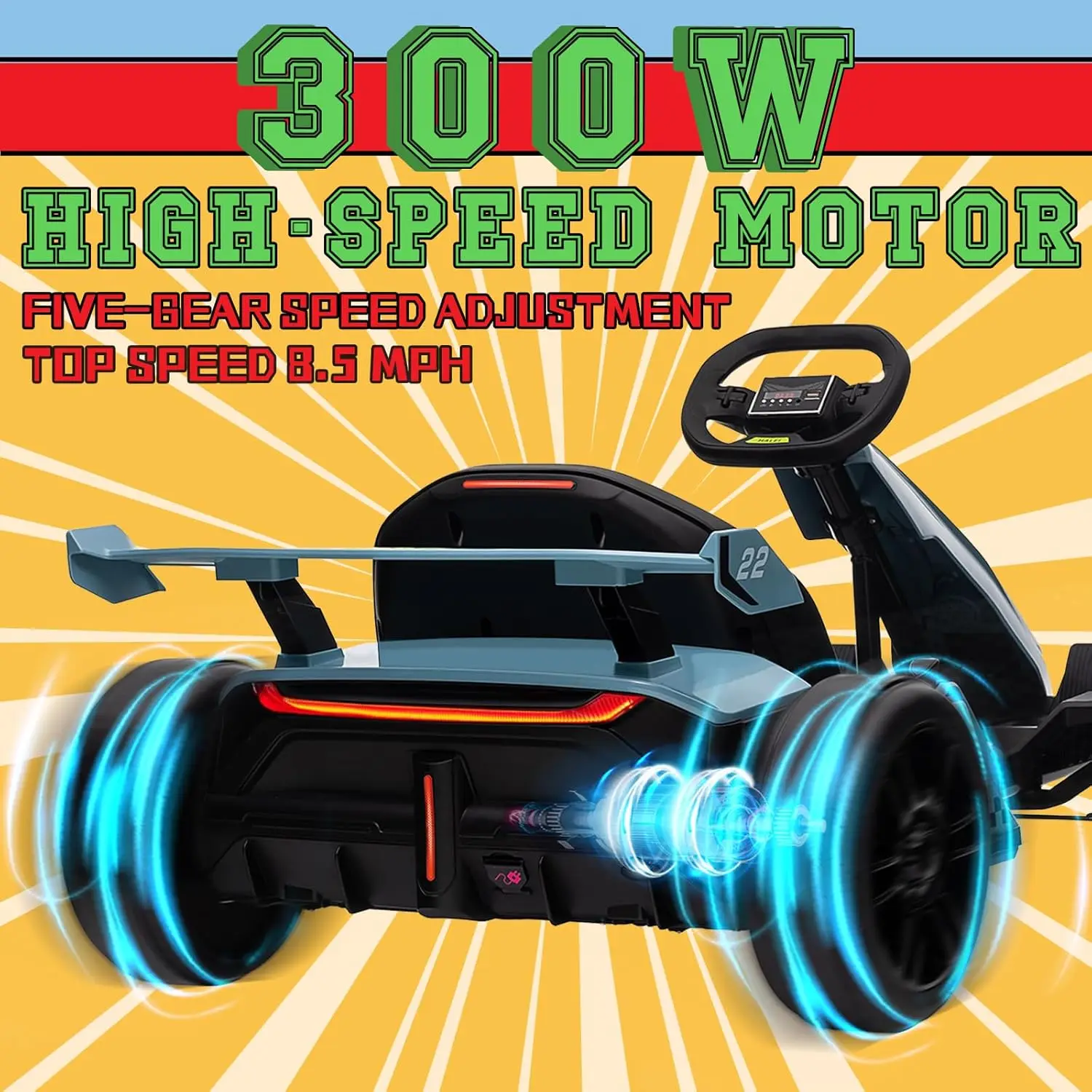 - 【Realistic Exciting Experience】electric kart car is equipped with a powerful 24V 300W motor, which can perfectly support high-speed experience in drift mode. kids electric car maximum high-speed of 8.5 mph,LED lights and brake lights can provide children with a more realistic and exciting racing experience.