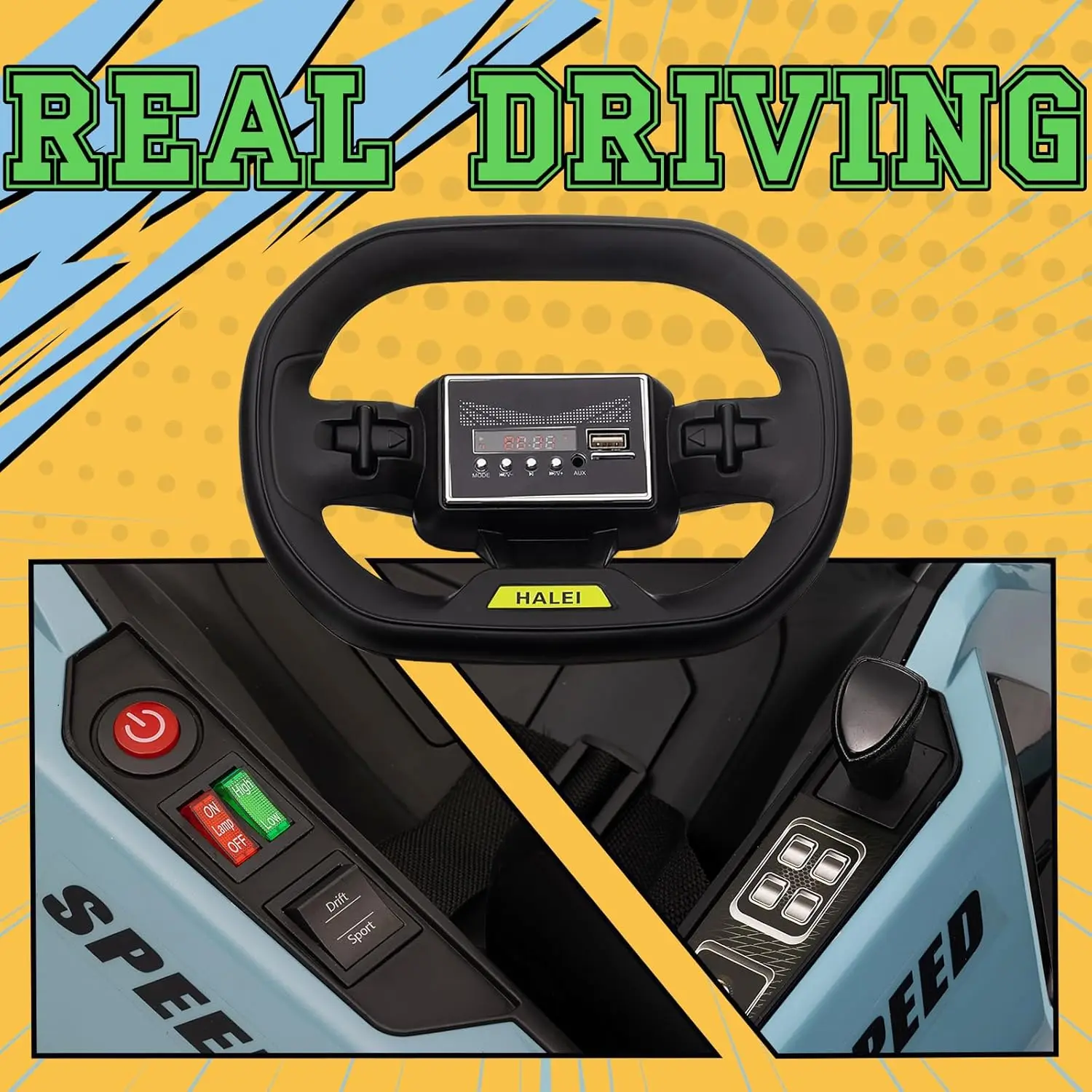 - 【Driving with Background Music】kids' electric vehicles can play music through USB,FM functions or bluetooth while your kids is driving a electric drift kart, making them feel like a professional racing driver, driving electric kart and drifting through dynamic background music.