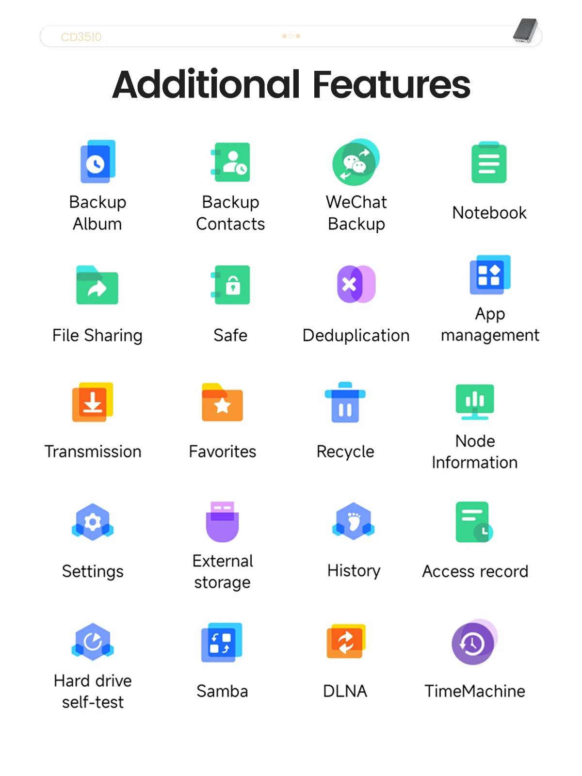 > Support automatic backup of mobile photo albums and files, as well as backup and recovery of address books.